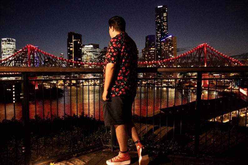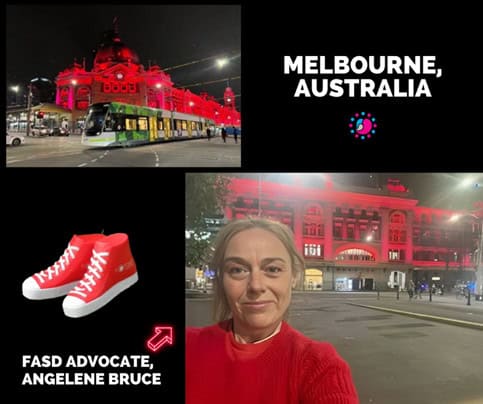 As well as events being held around Australia, our calendar also lists the various landmarks that will be lit up in red at some stage during September to recognise FASD and promote awareness. Last year over 50 landmarks joined this campaign and, as you’ll see in the photo at the top of this blog, Brisbane’s Story Bridge was one of these. It will again be lit up in red this year on 9th September (International FASD Awareness Day) as will a wide variety of other landmarks around Australia. Check the listings under the heading “Lights” in NOFASD’s listing of September events to see if there is a landmark near you that you can visit when it is lit up in red. If you do visit a landmark, we’d love you to share your photo on NOFASD’s social media or by email, together with a few words about how it made you (and your family) feel to see FASD acknowledged in such a public way. You can still maintain some confidentiality in sharing your photo – see the photo below from last year with a NOFASD supporter enjoying the sight of Brisbane’s Story Bridge lit up in red.